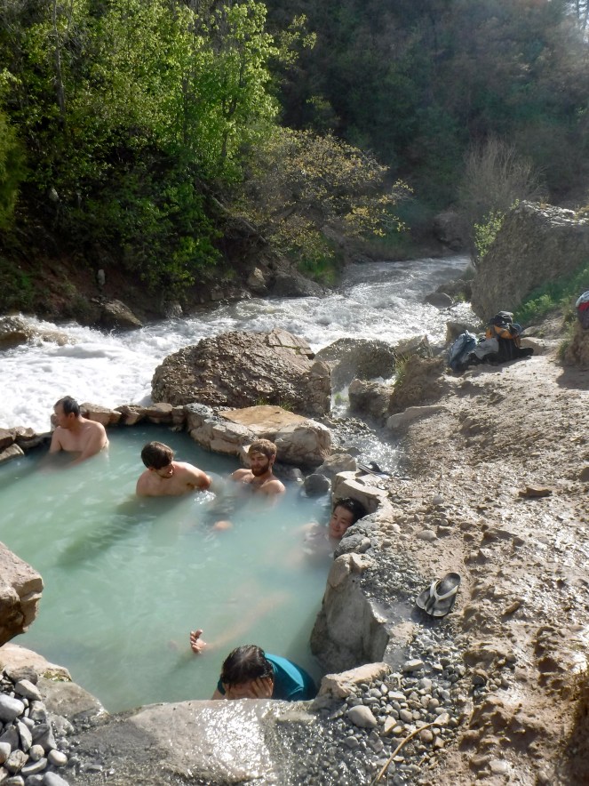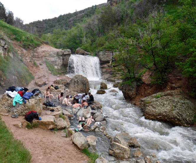 Back on the road, we decided our hot spring extravaganza wasn’t fulfilled. Michael called up John and easily convinced him to follow us off the freeway again and hop back in the van towards another set of hot springs. This time we had to hike a bit to get to them. Diamond Fork hot springs is about a 5 mile round trip hike. You walk along the river for a ways and eventually end up at various pools. You can go further past the first couple and reach some more, and even further down the trail is one that requires crossing the river to get to.