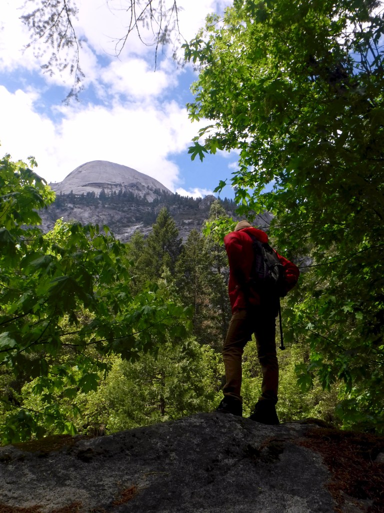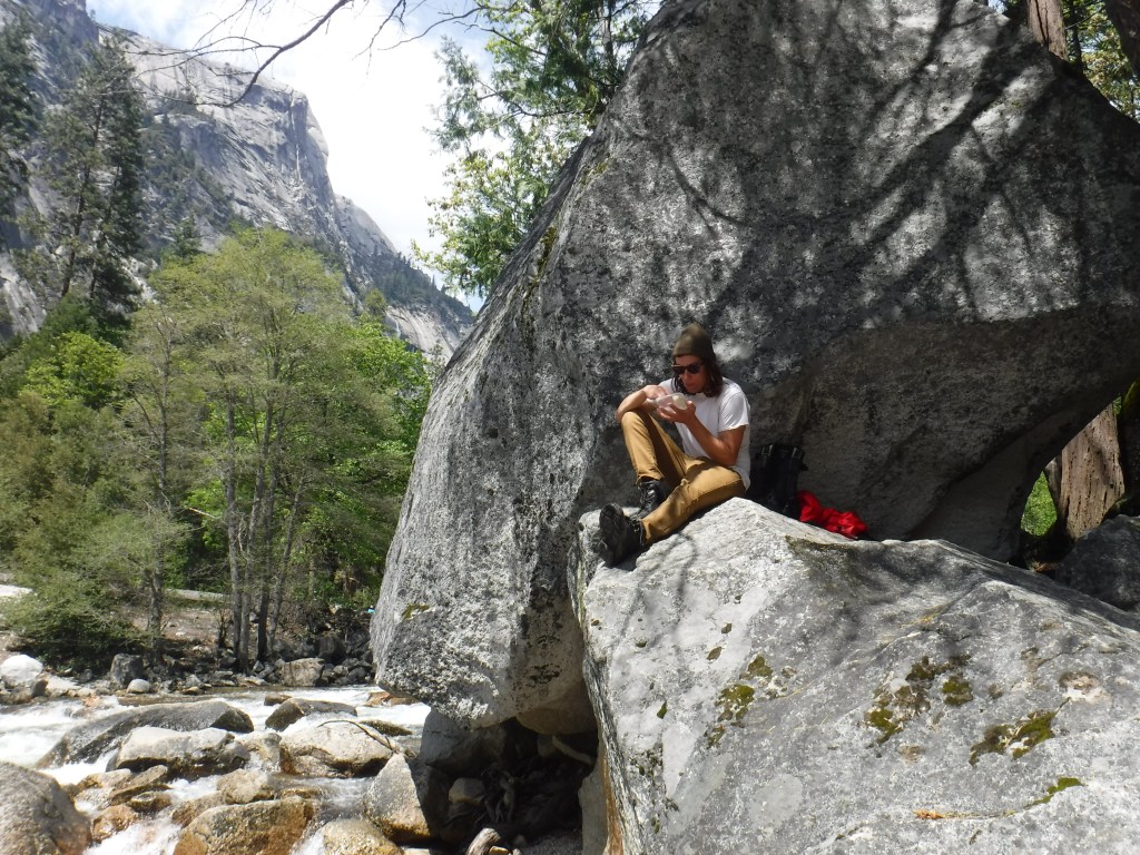 Since many of the trails were still closed due to the season, we decided on heading to Mirror Lake next. This hike was very mild but with exceptional views! Not only are you able to hangout around Mirror Lake, but you can see Half Dome and a clear view of Mount Watkins in the distance. We were a little surprised to see a bobcat walking right along side the path since it’s such a well hiked area but what an experience, right? After about a mile we arrived to the lake where Michael found a nice big rock on the water to sit and have lunch. Remember how I mentioned that snow storm/chains required thing? Well at this point we were basking in the sun with just our t-shirts on enjoying life.