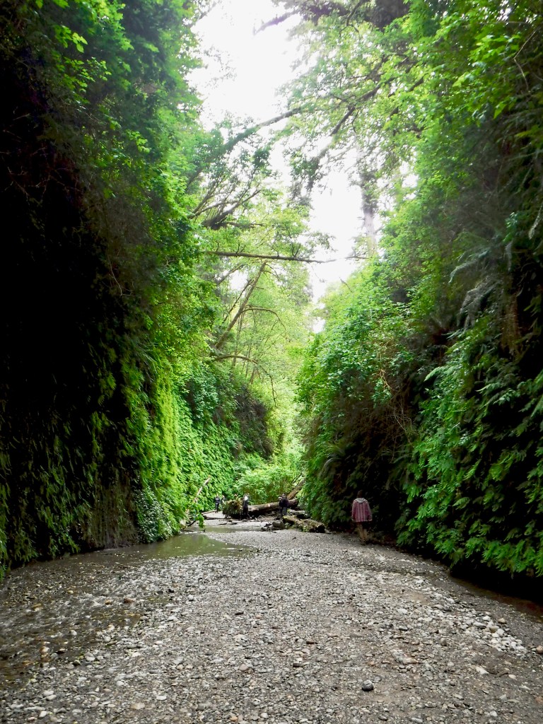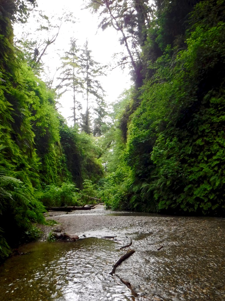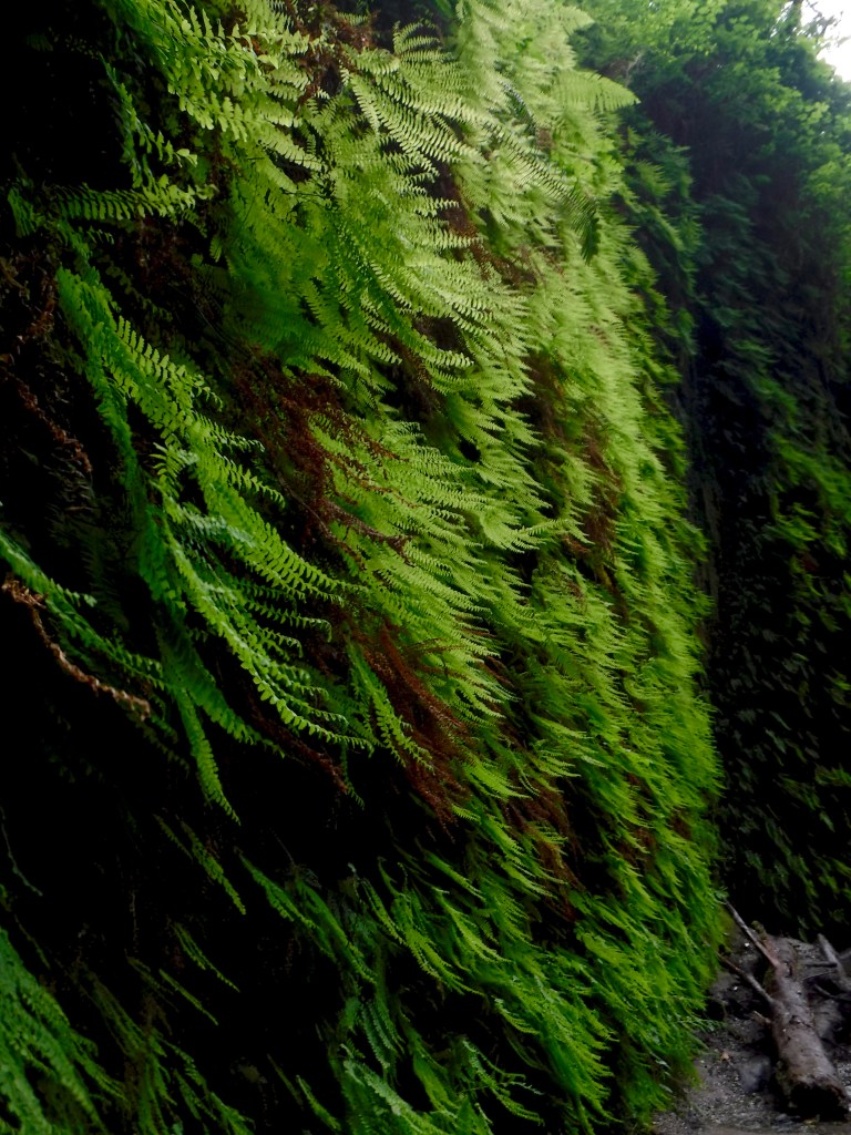 I don’t know if I’ve made it quite known yet, but ferns are one of my favorite plants. I’m sure you can guess my excitement when I read about Fern Canyon. The drive to the trail parking lot included dirt roads and many more elk along the way. A lot of people parked further away from the actual parking lot due to giant lake puddles that covered the road, so if you don’t feel like baha-ing your vehicle through the water that’s always an option. The hike to the canyon is relatively short and mild (from the real parking area,) and you can make it as short as you want. Apparently the whole hike can be done as a 1.1 mile loop, however we just went as deep into the canyon as we could without climbing over too many fallen trees or getting too wet. The views themselves are beautiful. The walls become covered with cascading ferns from top to bottom and everything is so lush and green.