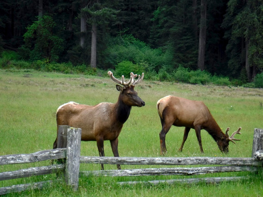 After our hike back up, we went to our second visitor center of the park so I could get a postcard. This visitor center was pretty cool and included an “Elk horn” tree which isn’t actually a real tree at all. The story is that an elk rammed a tree so hard its antlers got lodged and the tree ended up growing around the skull. This stop was also pretty neat because right outside is a large field where elk graze and gather. There were about ten elk and everyone was stopped all over to see them.