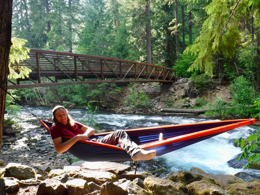 After hanging out in the pools we walked back to the parking area and decided to hang out more (literally) by the river. We tied up our hammock and ate a few snacks before driving out of the National Forest and into BLM land. Once again it was time to start looking for a spot to park for the night. We wanted to have a fire so we pulled off on to some windy dirt roads that were probably used as logging trails. After driving for a while we pulled off thinking we had found a spot. Although the sunset view over the mountains was nice, we decided to head back to an area we saw near the beginning of the road. This was definitely the spot too. It was down lower to the side of the road in a crater/bowl with no trees around. There were already the remains of a fire someone previously had as well. We spent the night having a couple drinks, sitting by the fire, and stargazing at the clear night sky.