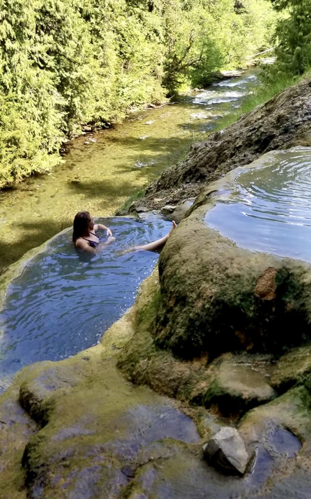 The chain of hot pools here cascade over the cliff side, overlooking the Umpqua River. We hung out in one of the empty pools in a rock bowl for a little bit before heading down a rope to the river where there was another more private pool. This one was hotter than the upper ones and it went into a mini cave that was home to a few small bats. There’s also a pool at the very top that has a wood structure covering it. On top of the various pools the area is clothing optional! The $5 parking fee is definitely worth the short trip to these hot springs.